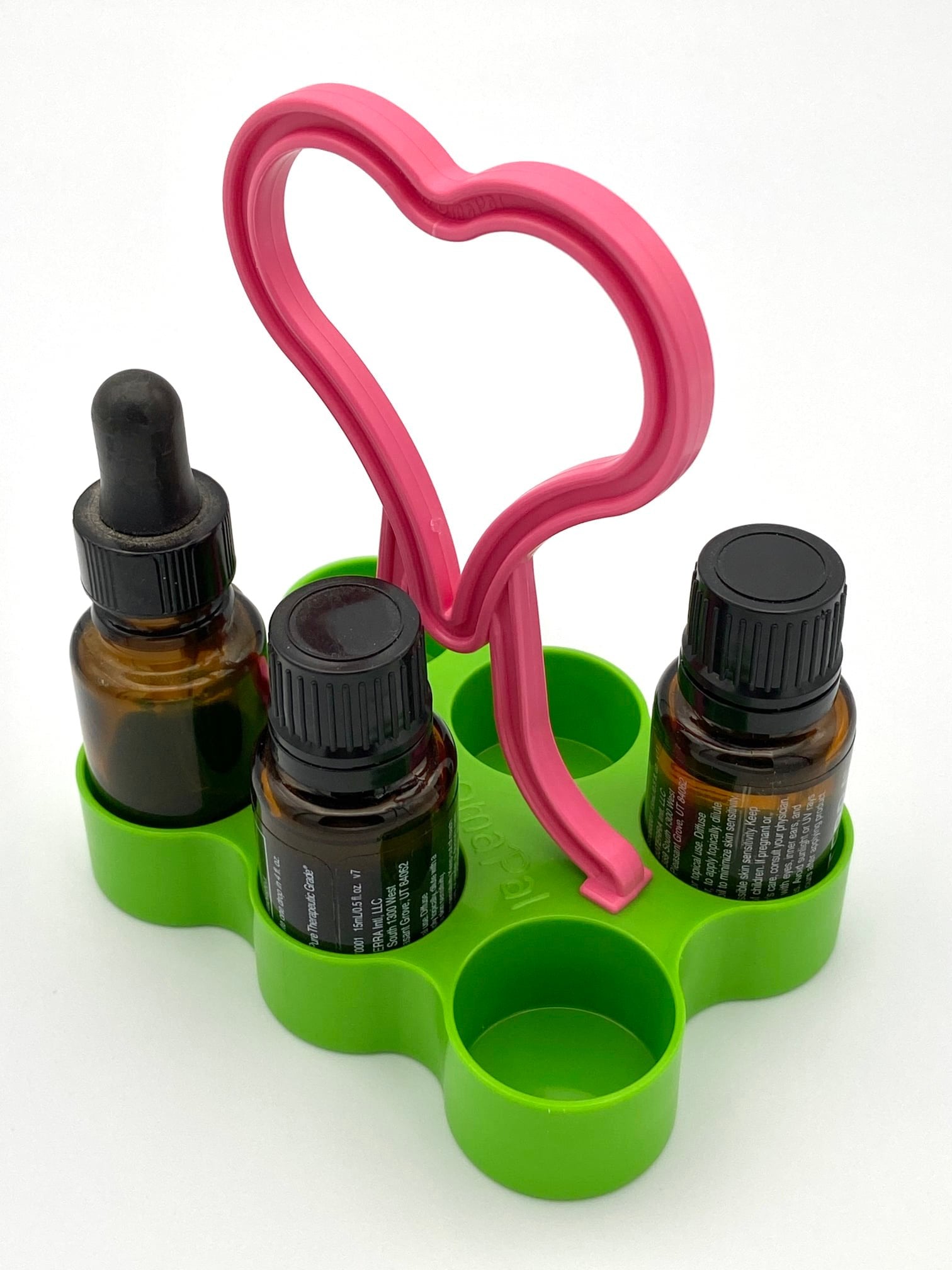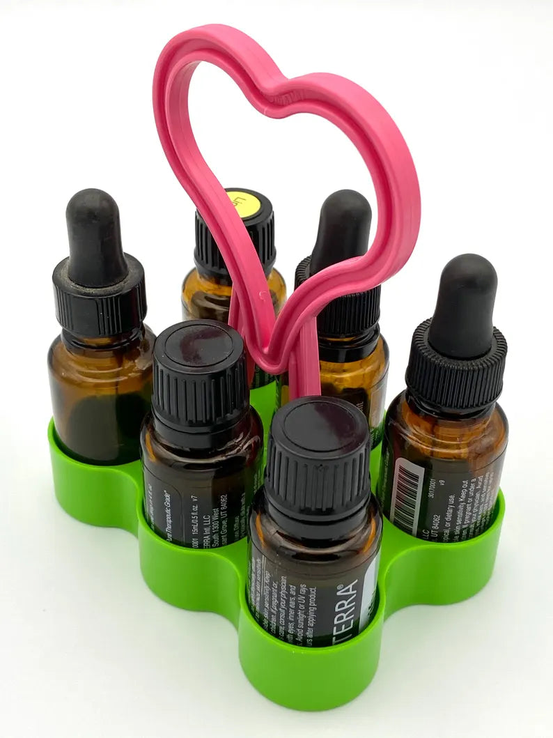 Este suporte é uma forma prática de exibir e/ou transportar seus óleos essenciais. É um ótimo companheiro para manter os óleos à mão. A alça fica alta o suficiente para que você possa usar até mesmo frascos com conta-gotas; o formato da alça ajuda a equilibrar a base do suporte enquanto você o carrega com as mãos, não importa quantos frascos ele contenha.